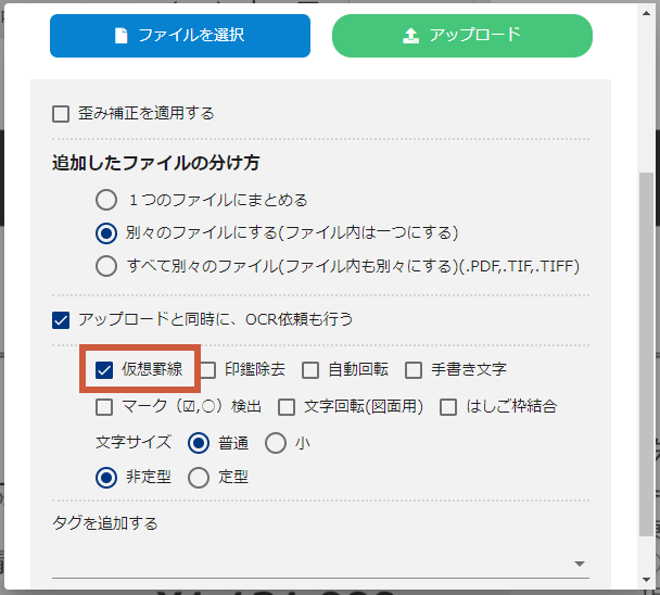 もしくはアップロードする際に選択とOCR 依頼を同時に依頼することも出来ます。「仮想罫線」をクリックし、「OCR依頼」ボタンを押すとそのままOCR 依頼されます。